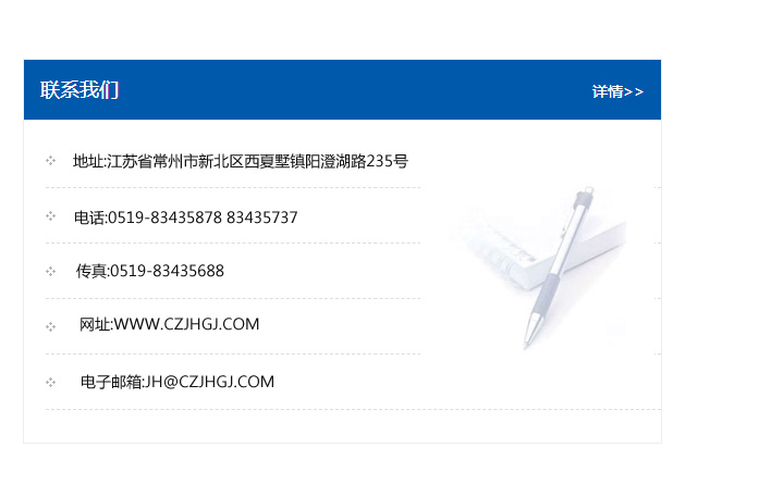 傳真:0519-83435688    郵編:213135    網址:WWW.czjhgj_com.lexus-tj.com    電子郵箱:JH@czjhgj_com.lexus-tj.com